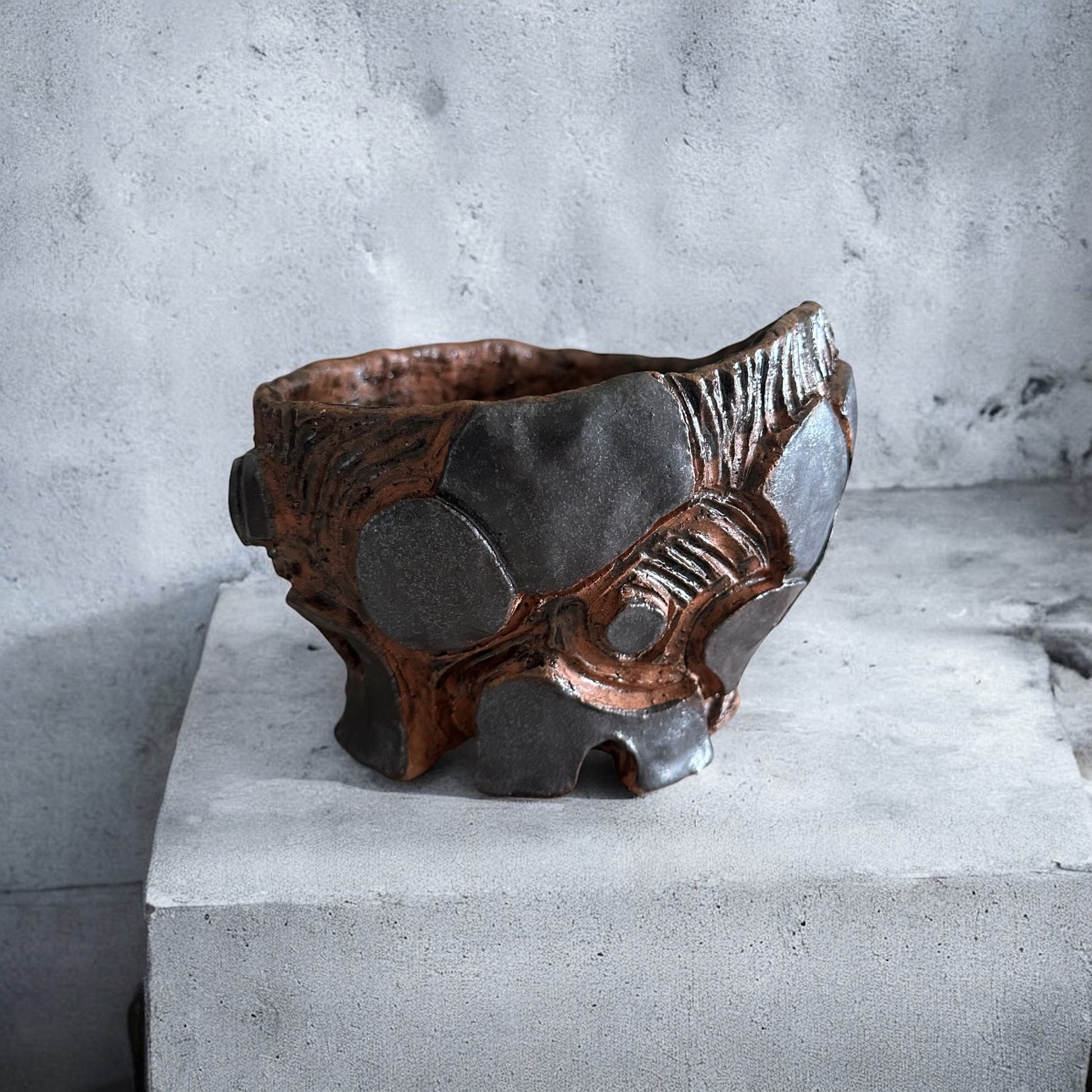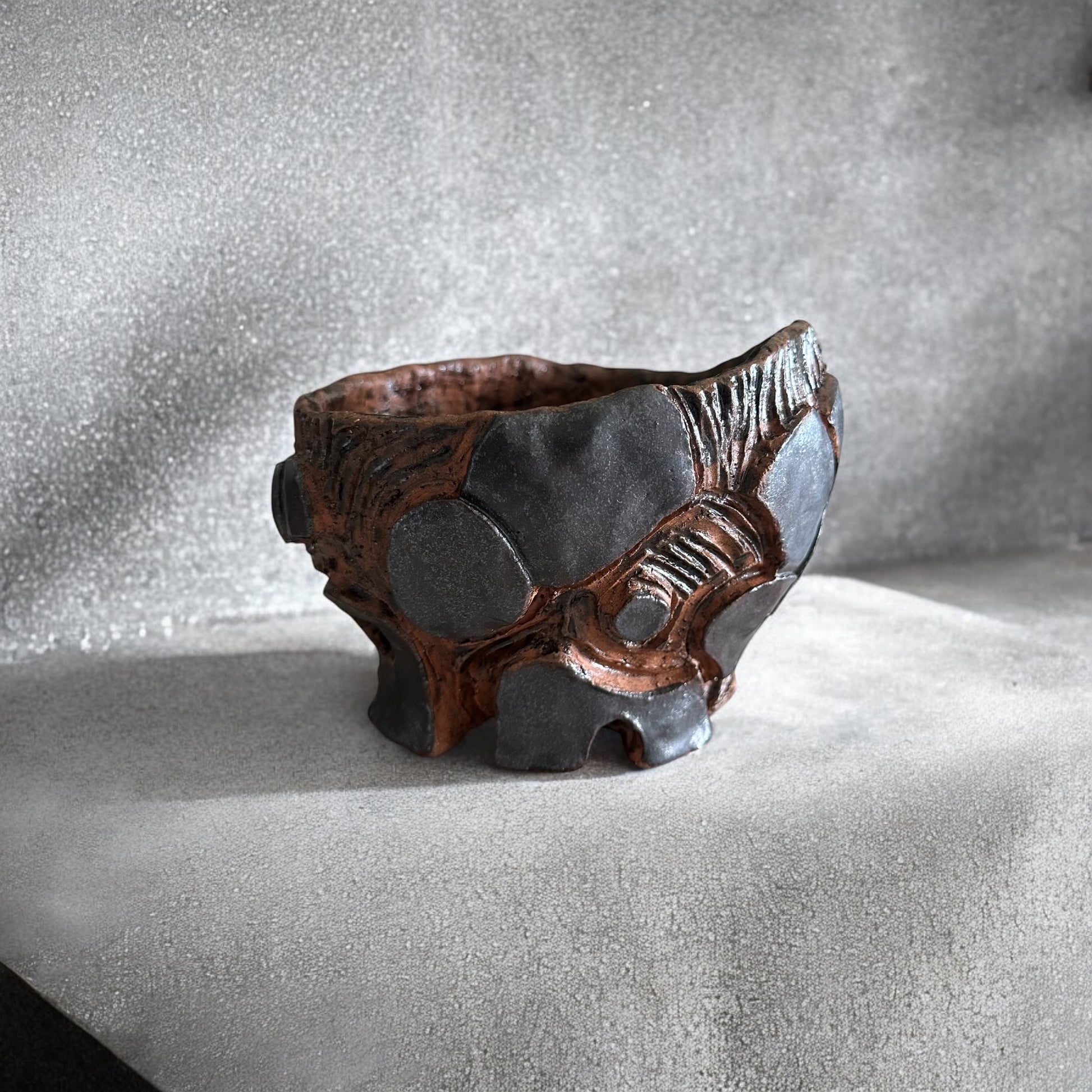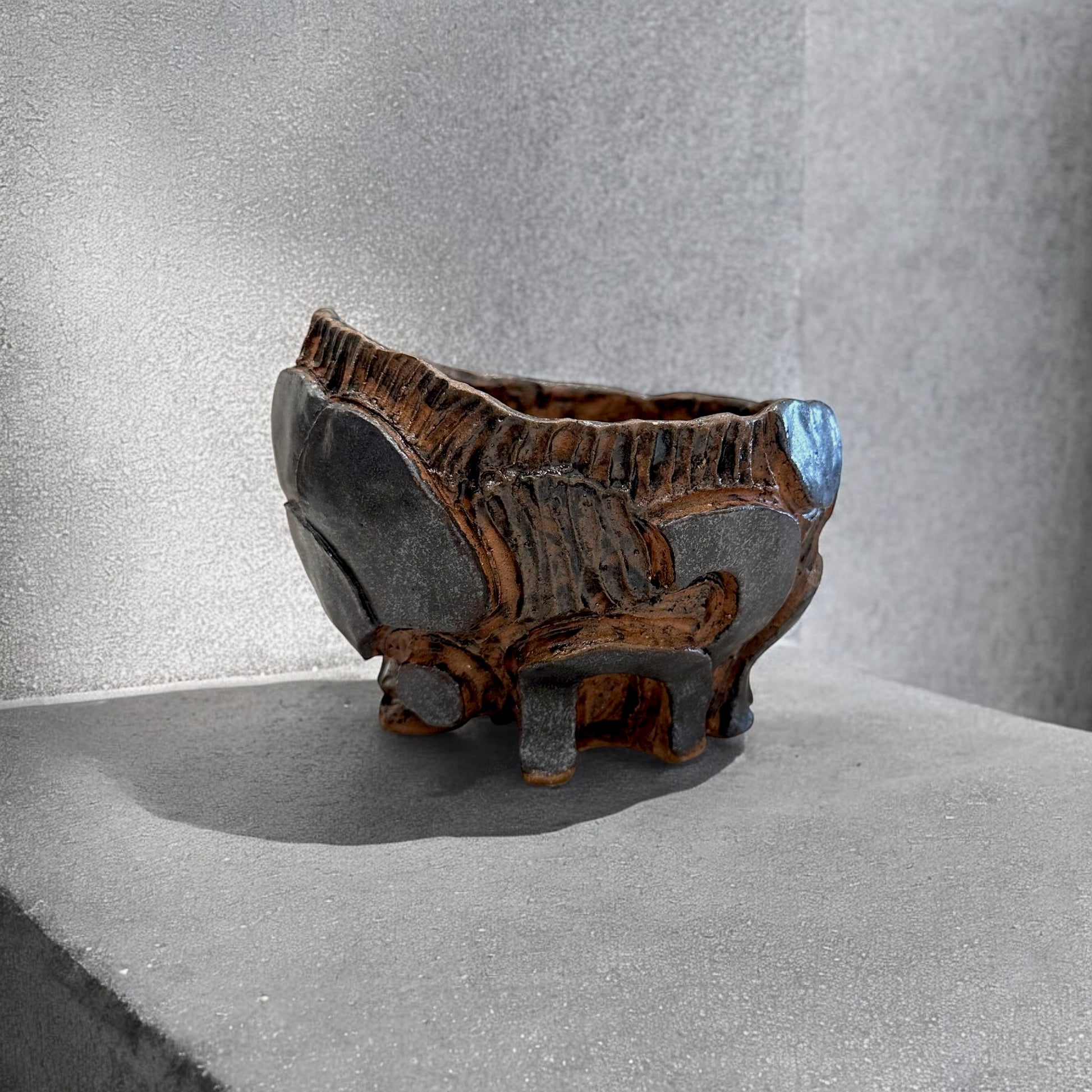 銅紅色釉面如熔岩般滲流,墨黑礦肌在其中沉穩交錯,彷彿岩層推擠後留下的地質斷面,每一處裂縫、凹痕、紋理,都是時間與雙手共譜的痕跡。
