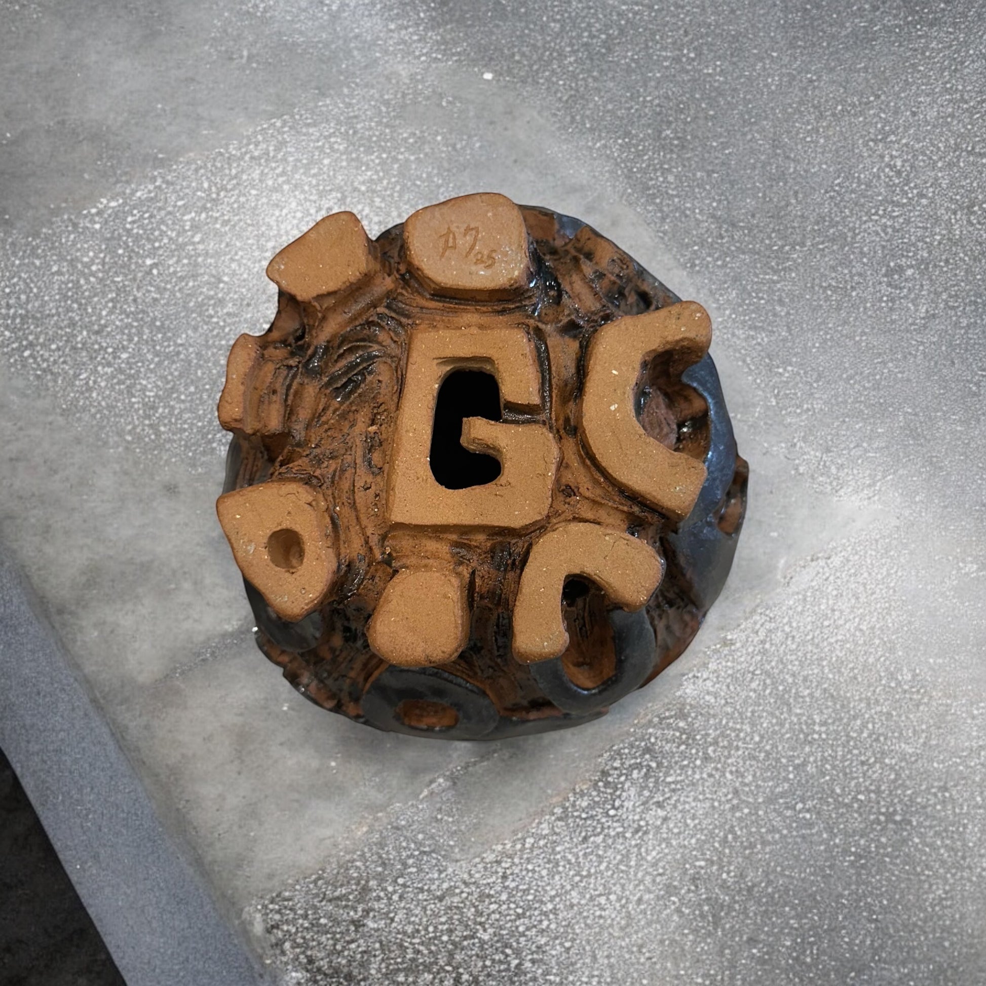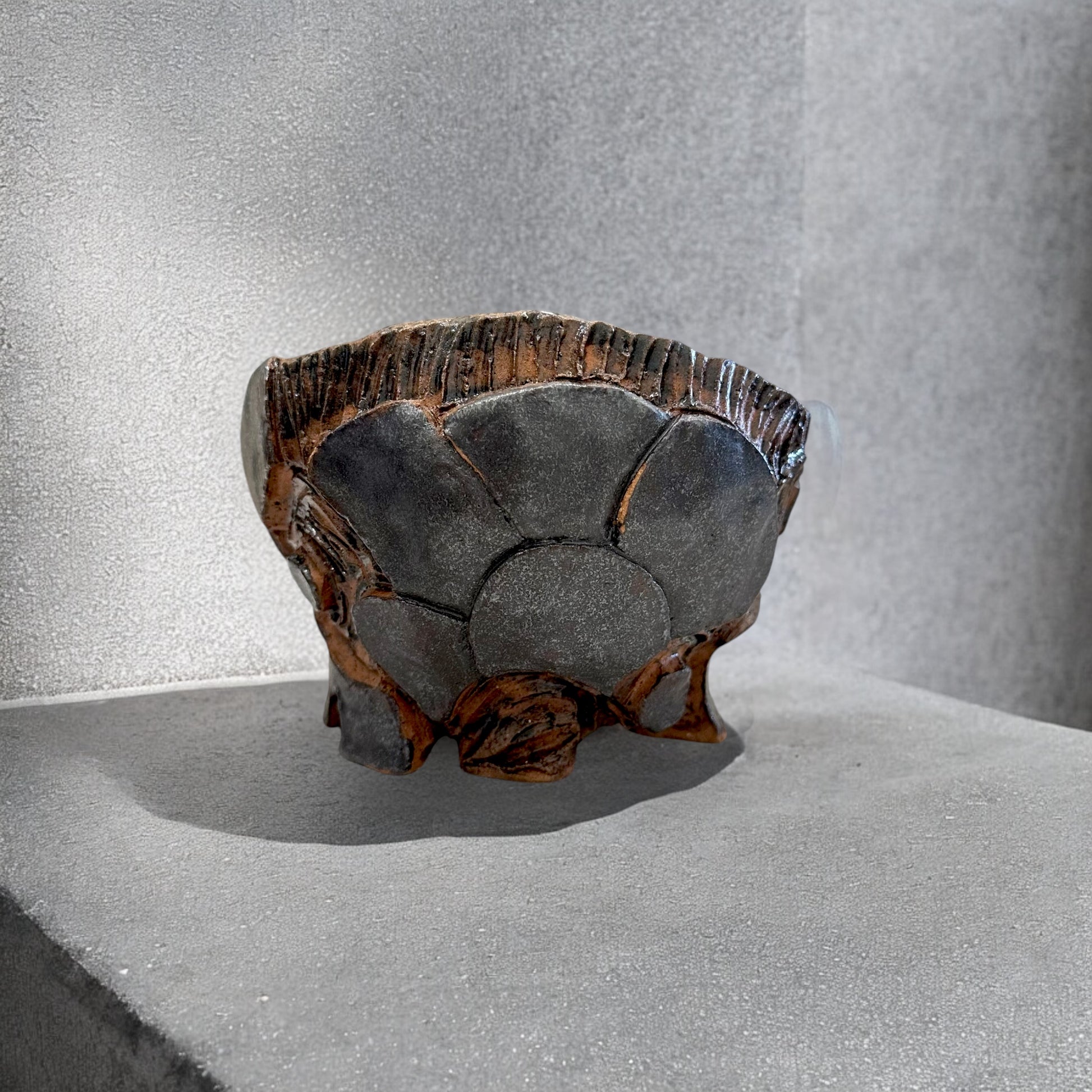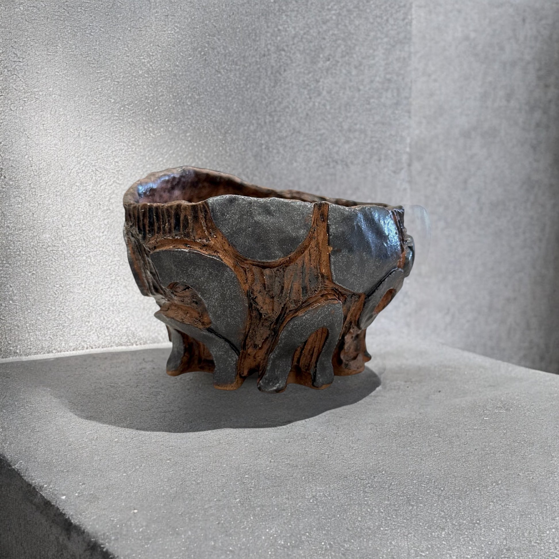 銅紅色釉面如熔岩般滲流,墨黑礦肌在其中沉穩交錯,彷彿岩層推擠後留下的地質斷面,每一處裂縫、凹痕、紋理,都是時間與雙手共譜的痕跡。