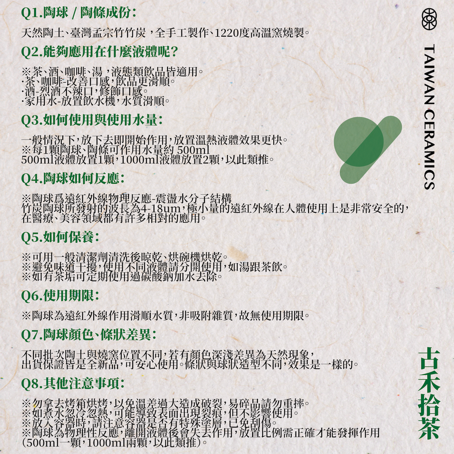 ※陶球為物理性反應,離開液體後會失去作用,放置比例需正確才能發揮作用(500ml一顆,1000ml兩顆,以此類推)。