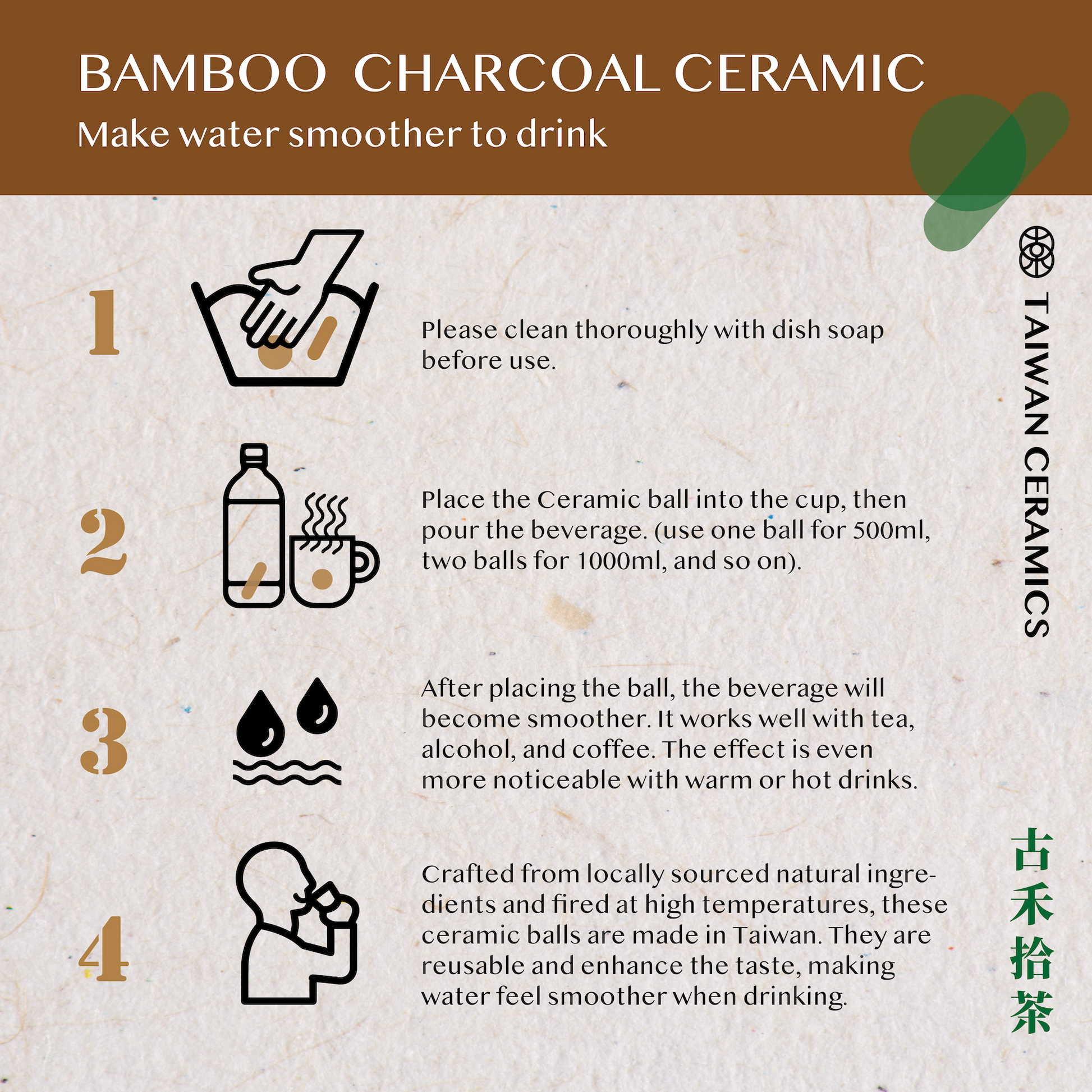 將竹炭加入陶土中燒製後,因為易清洗、耐保存,使用上更加方便。竹炭釋放的遠紅外線,可以活化細化水分子,促進人體細胞吸收,放在水杯中是最棒的養生產品。
