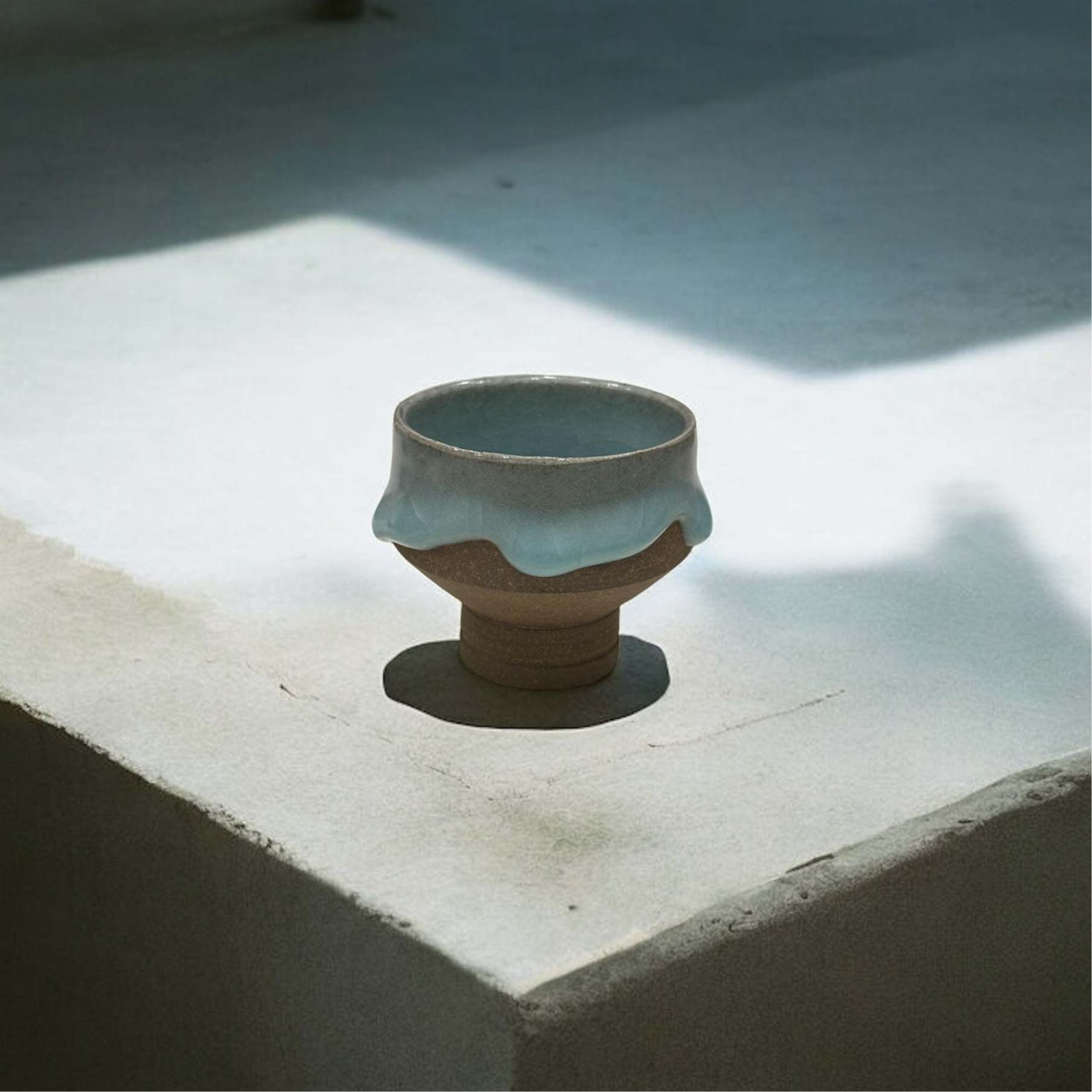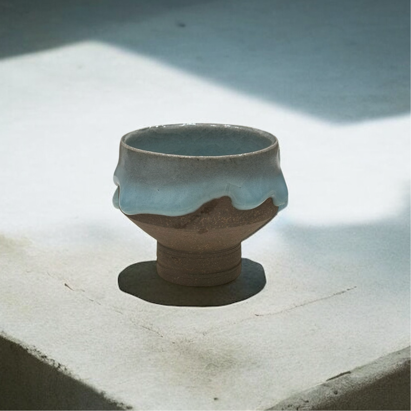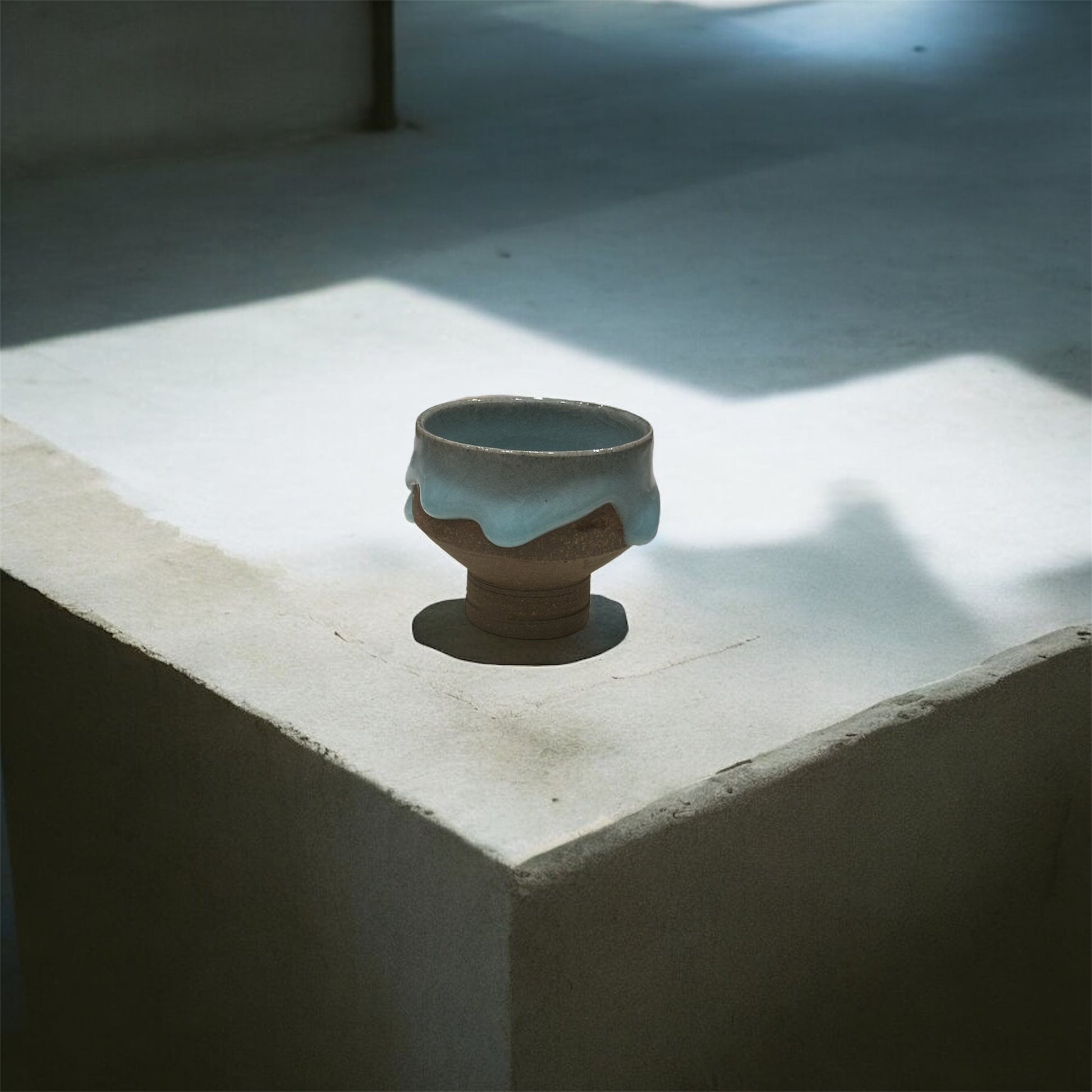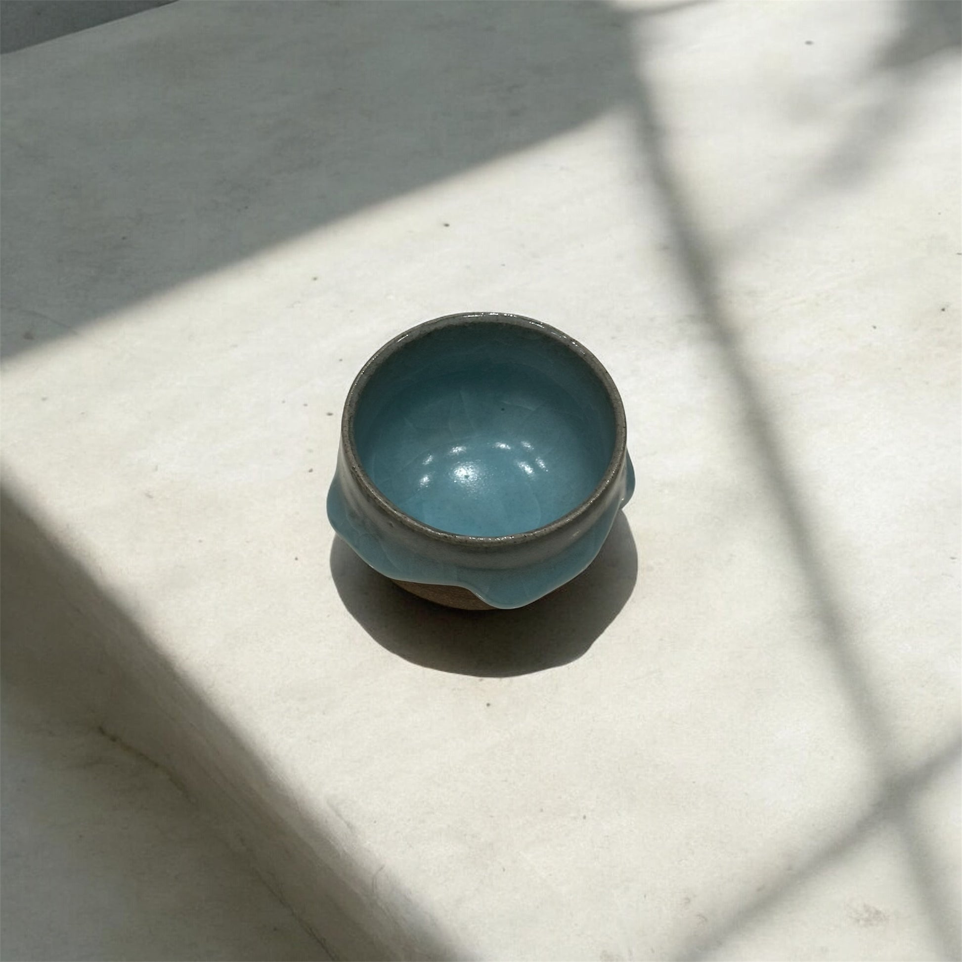 柔和的線條與獨特的釉彩效果,讓人聯想到自然融化的冰雪。杯身的裸色陶土質地與柔藍釉面的相互融合,呈現出一種質樸卻不失精緻的美感。每個杯子皆為手工製作,展現出每件作品的獨特性與創作者的心血。