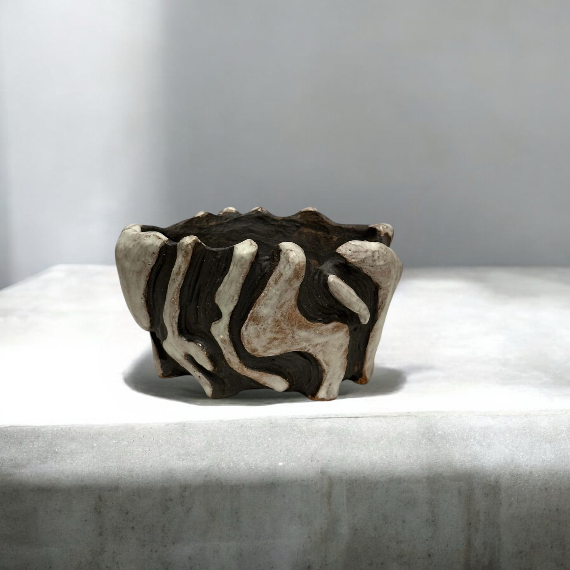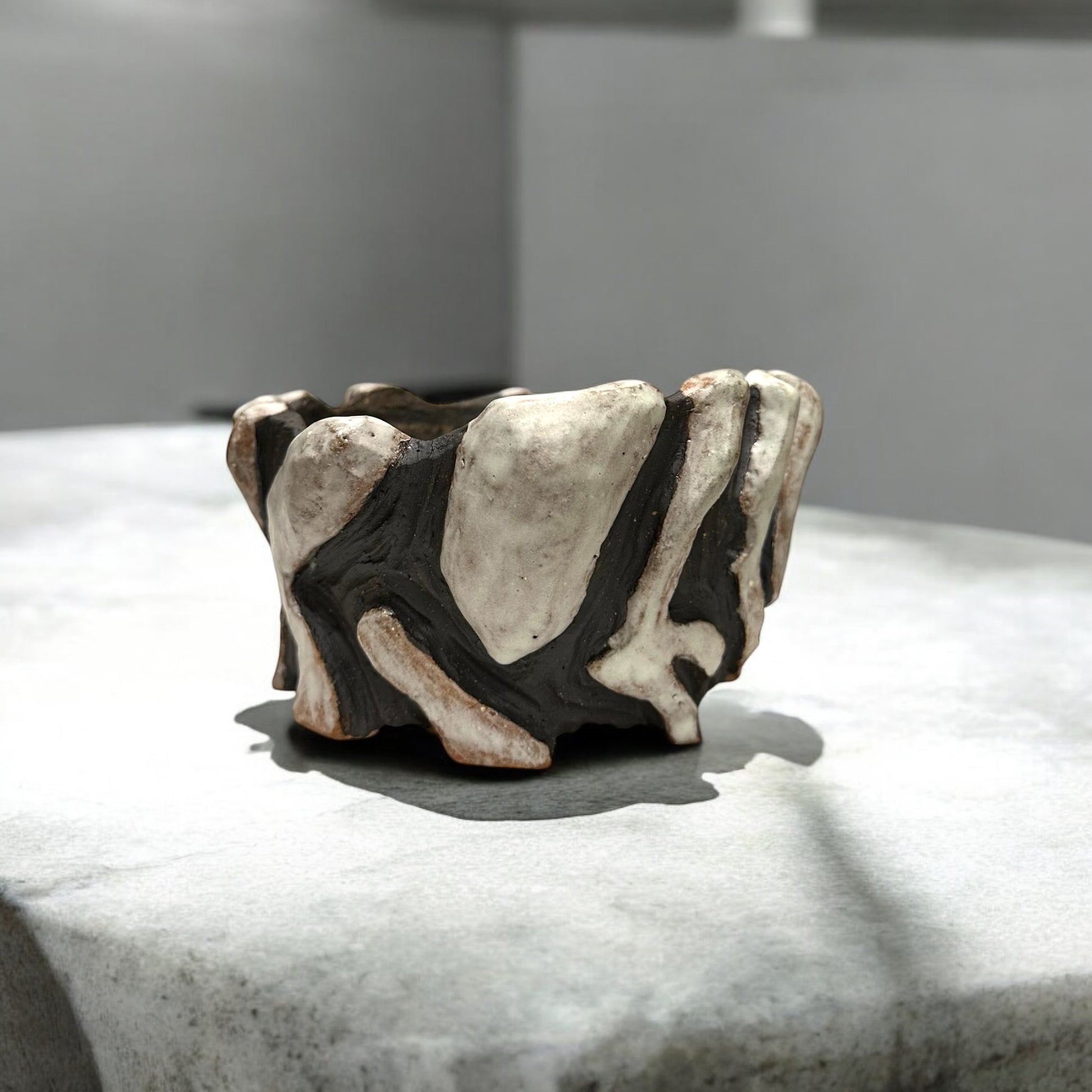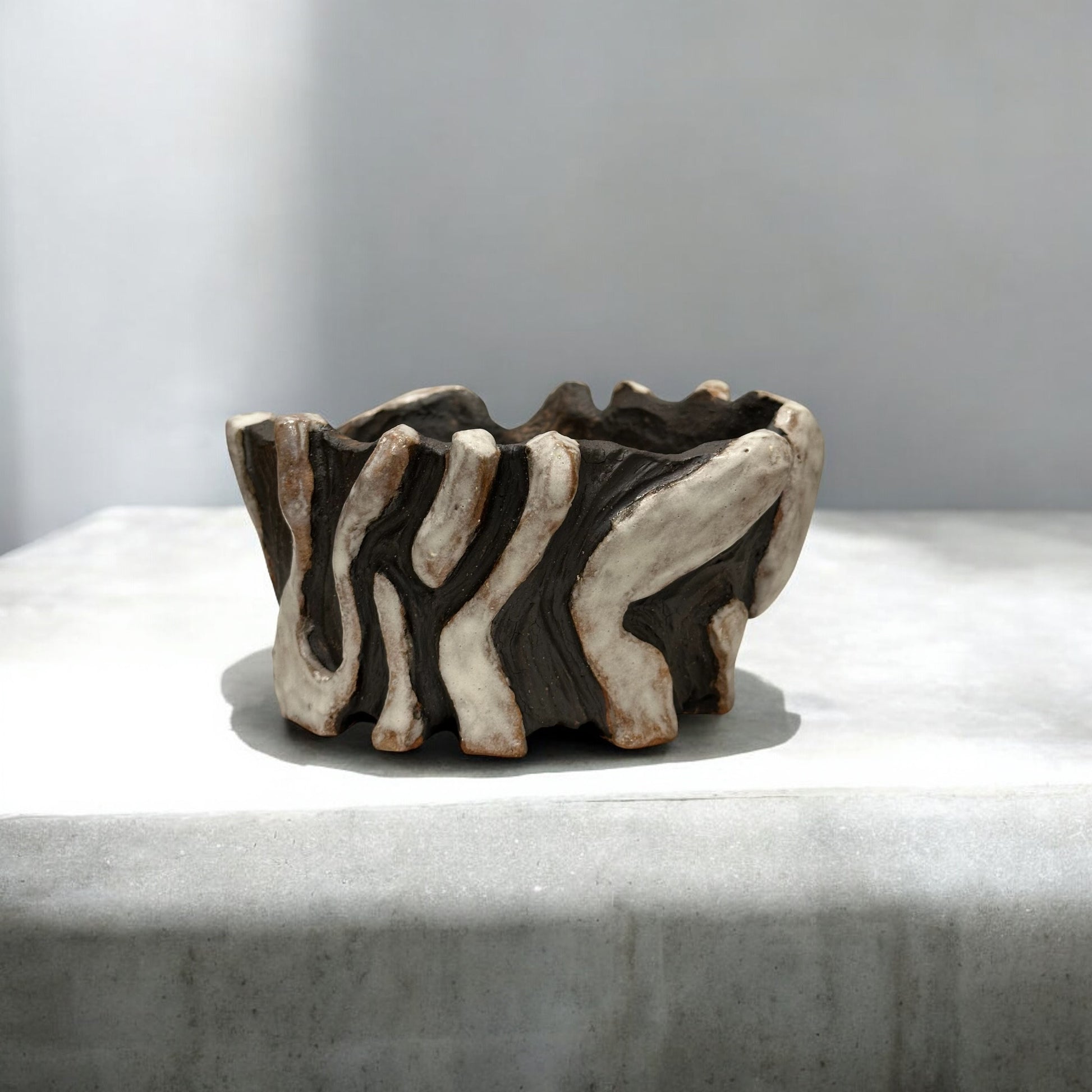 彷彿是地層運動的縮影,黑白交錯的紋理宛如岩層堆疊,描繪出大地滄桑與時間流轉的軌跡。每一道曲線,都是雙手與泥土共舞的印記,展現出不受拘束的自然律動。