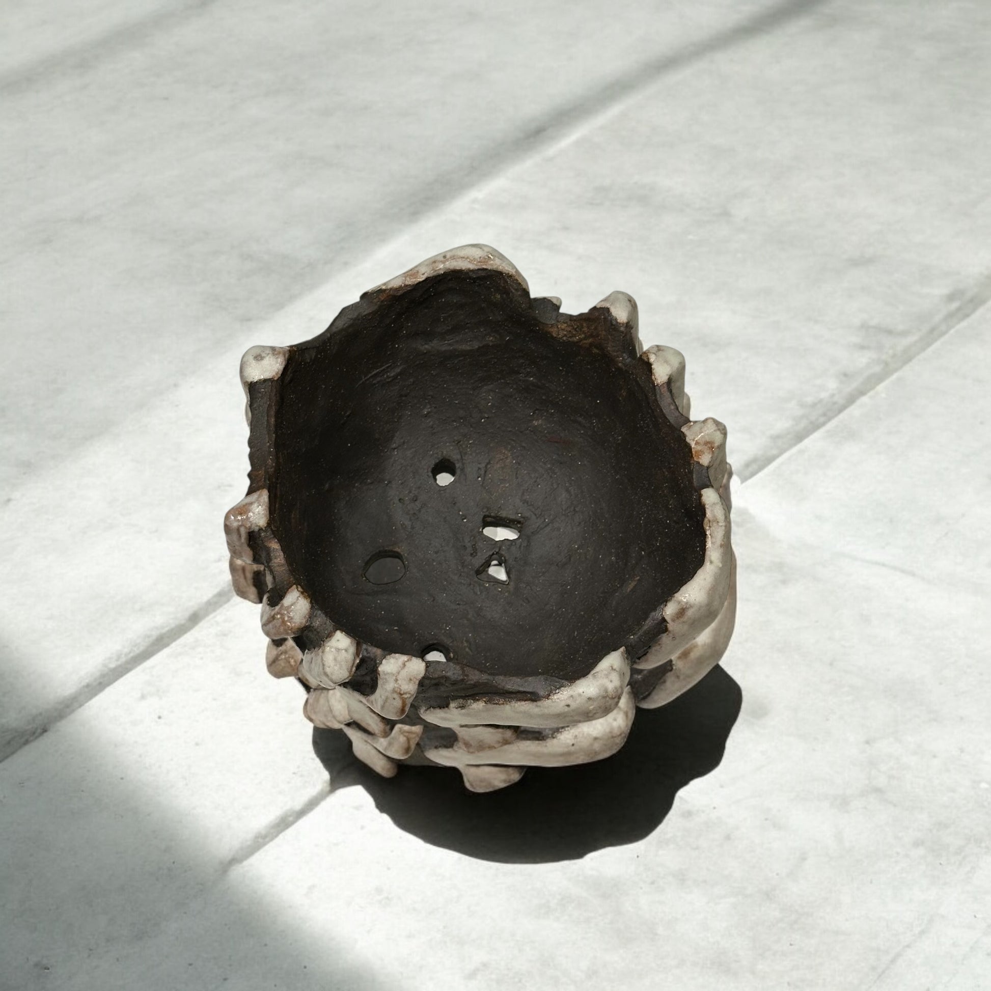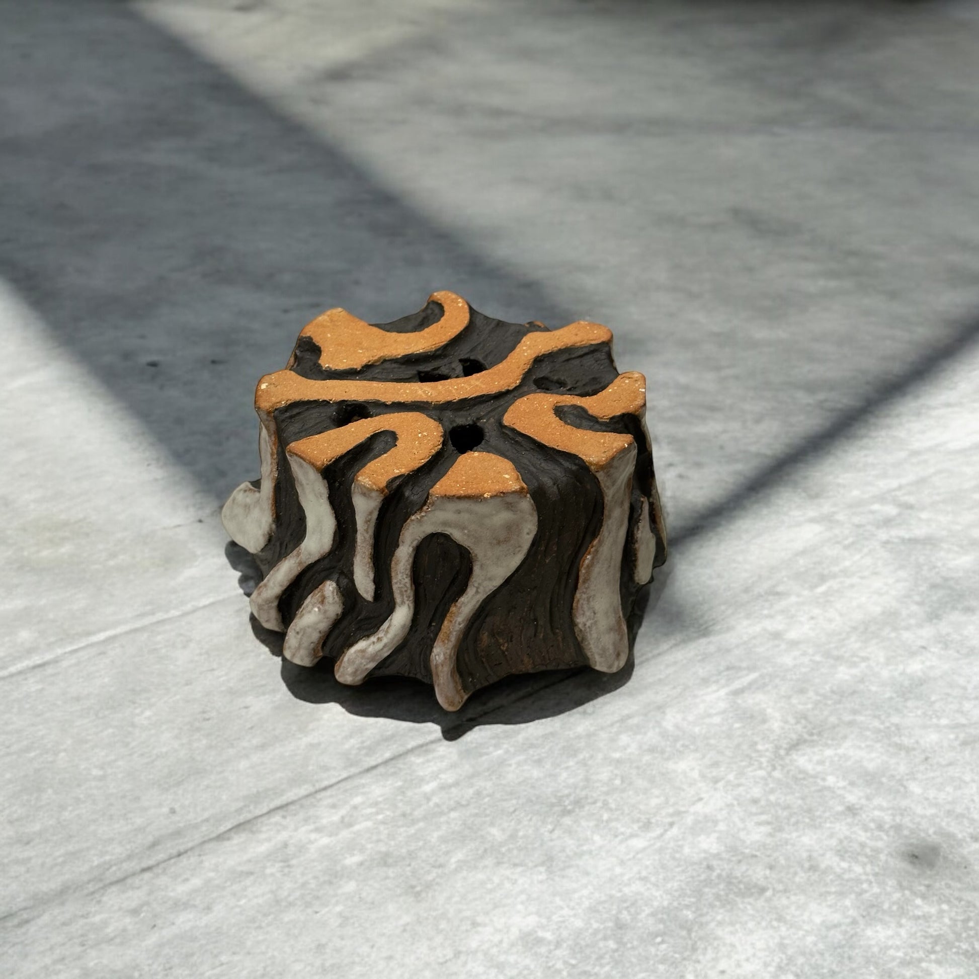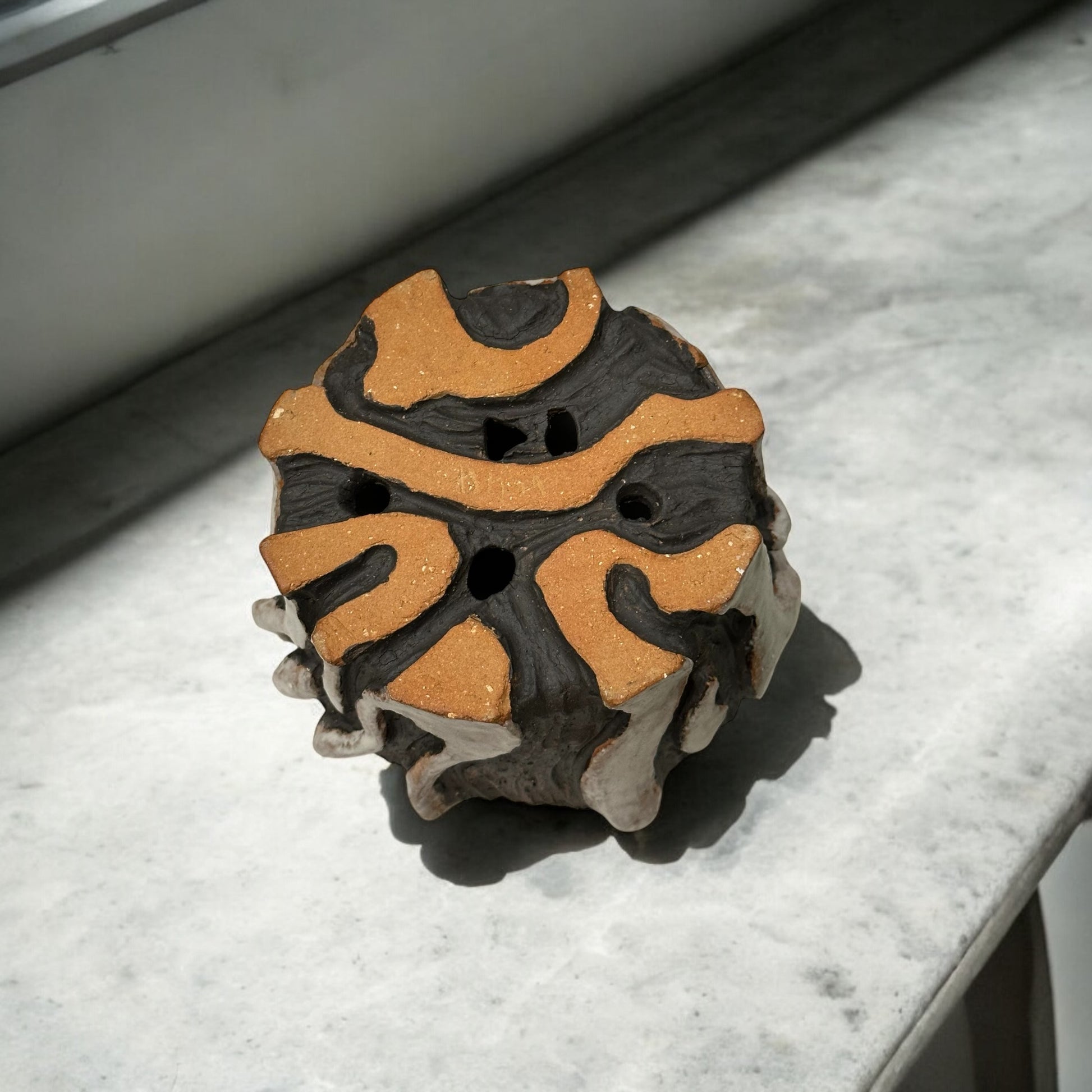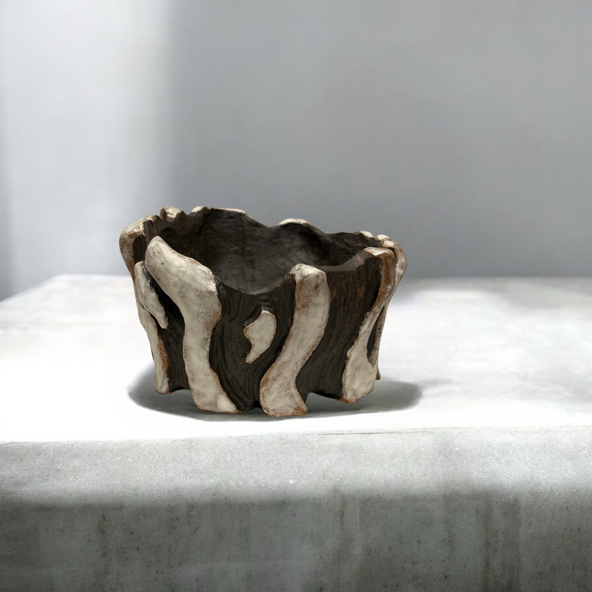 彷彿是地層運動的縮影,黑白交錯的紋理宛如岩層堆疊,描繪出大地滄桑與時間流轉的軌跡。每一道曲線,都是雙手與泥土共舞的印記,展現出不受拘束的自然律動。