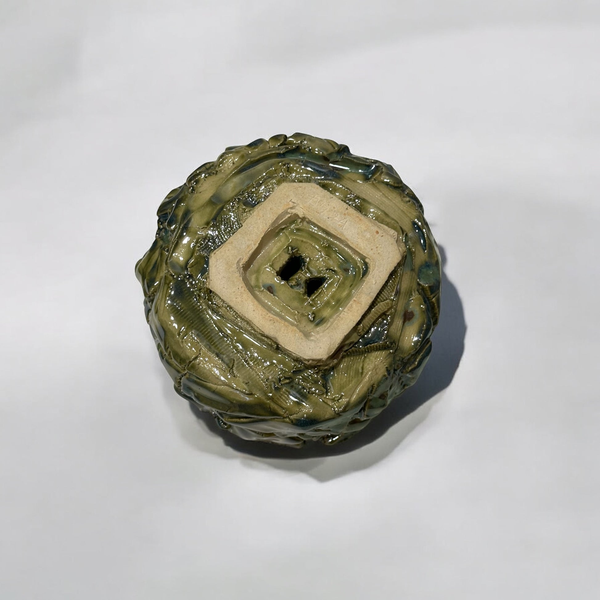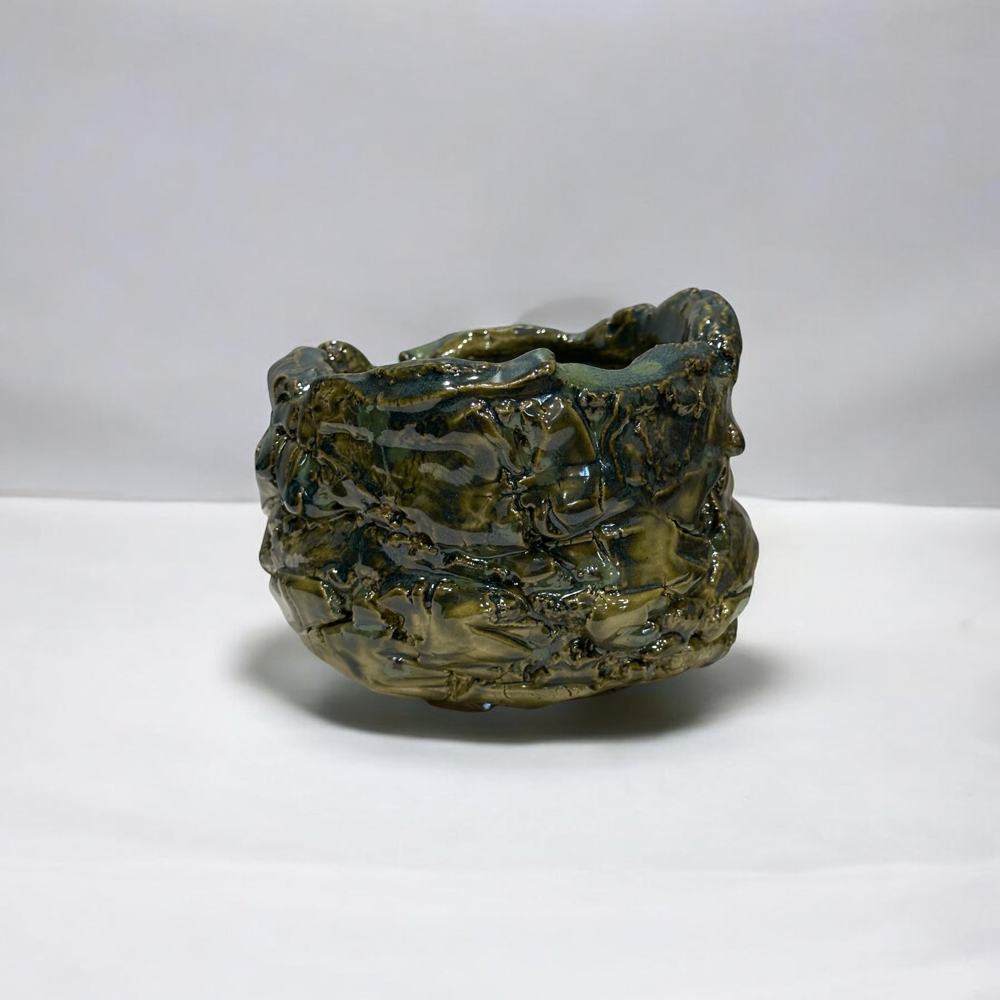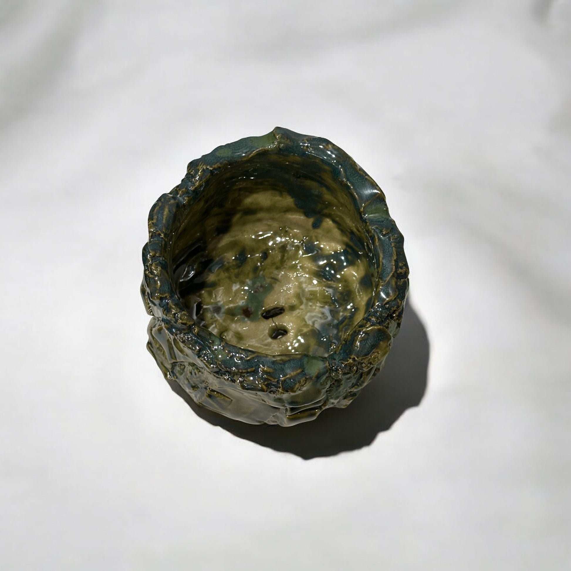 荒岩綠晶手工陶盆彷彿來自遠古山脈的碎岩,以不規則的紋理與粗獷的皺褶,刻畫出大地風化的痕跡。深邃的墨綠與金黃交錯,宛如苔蘚覆蓋的峭壁,在光影間閃爍自然的流動感。