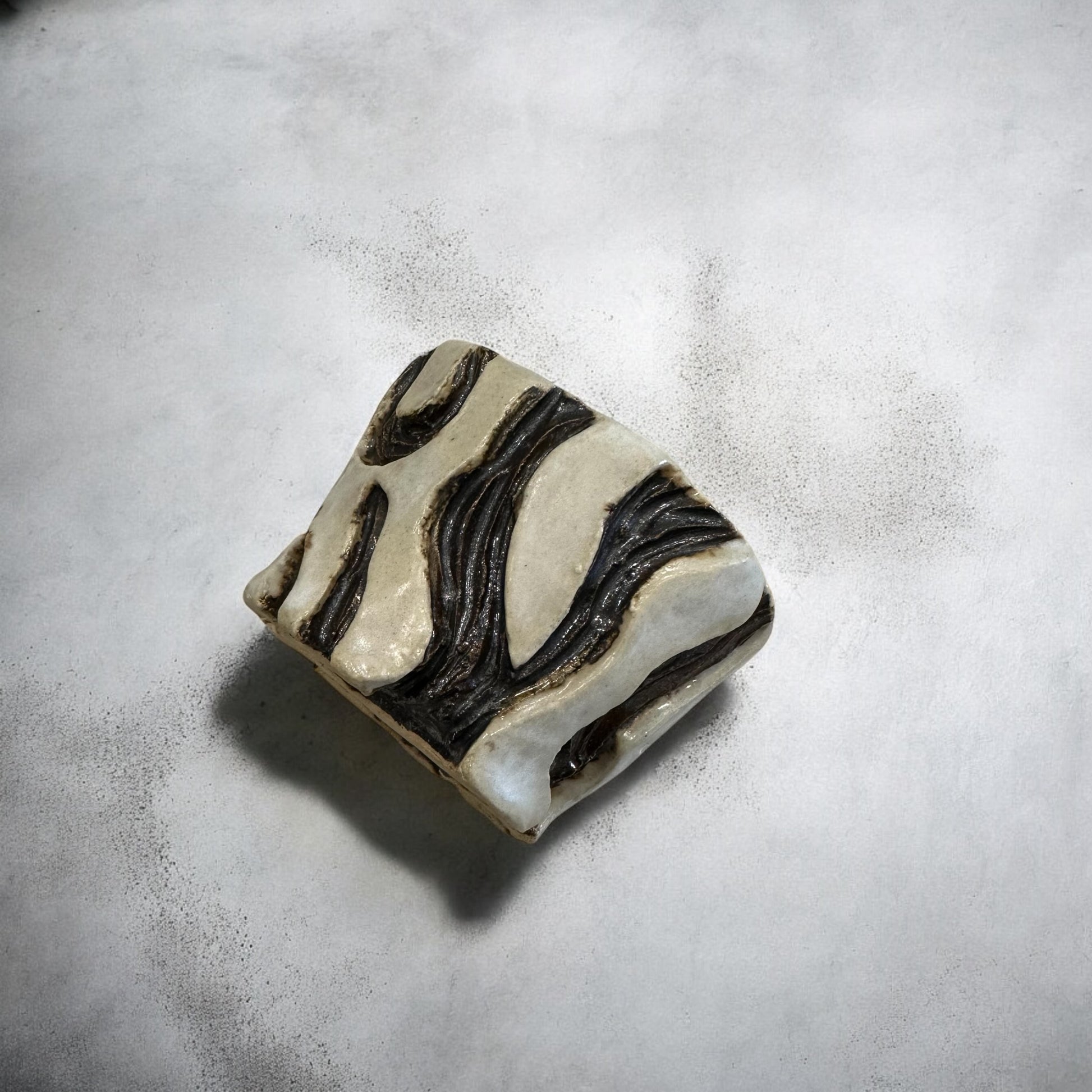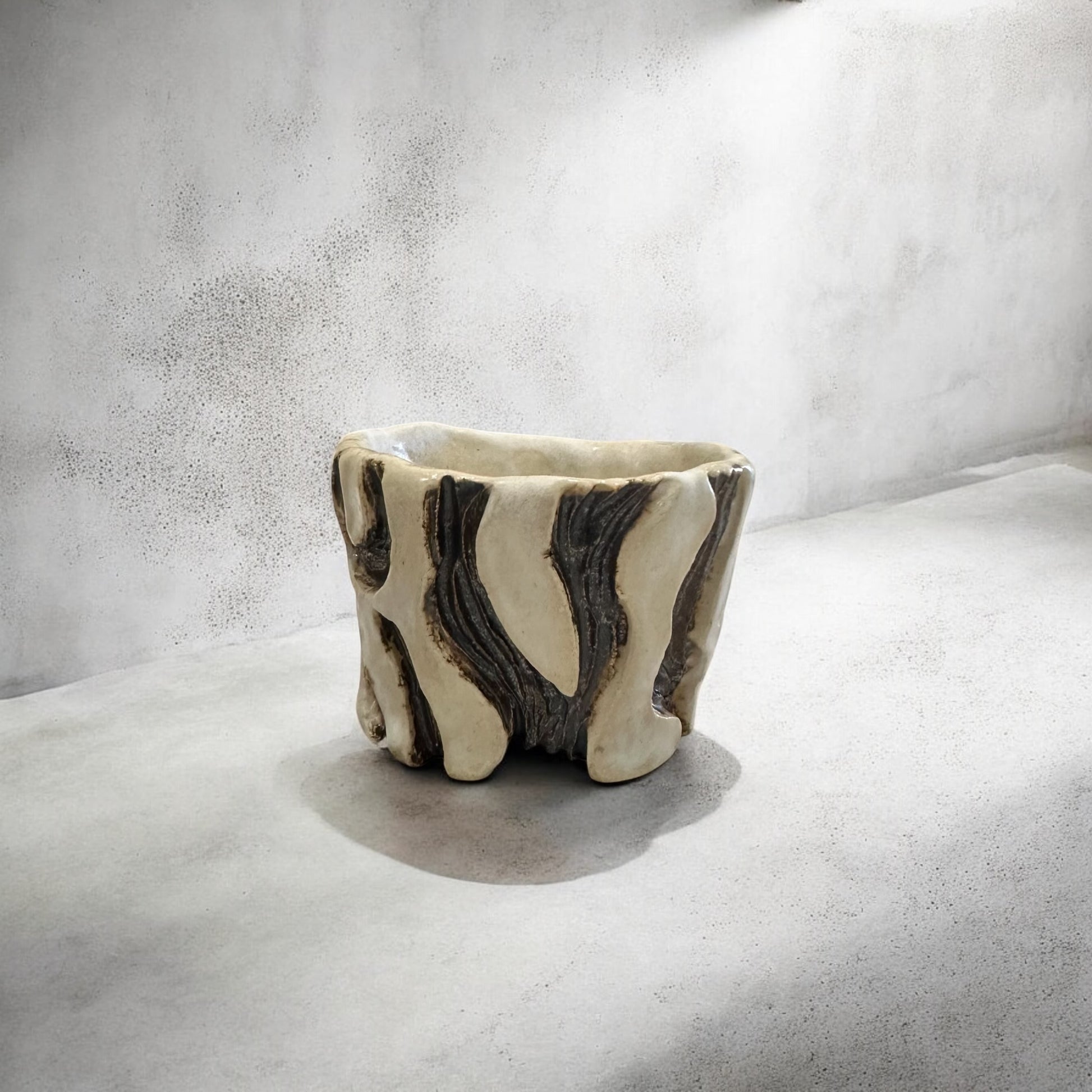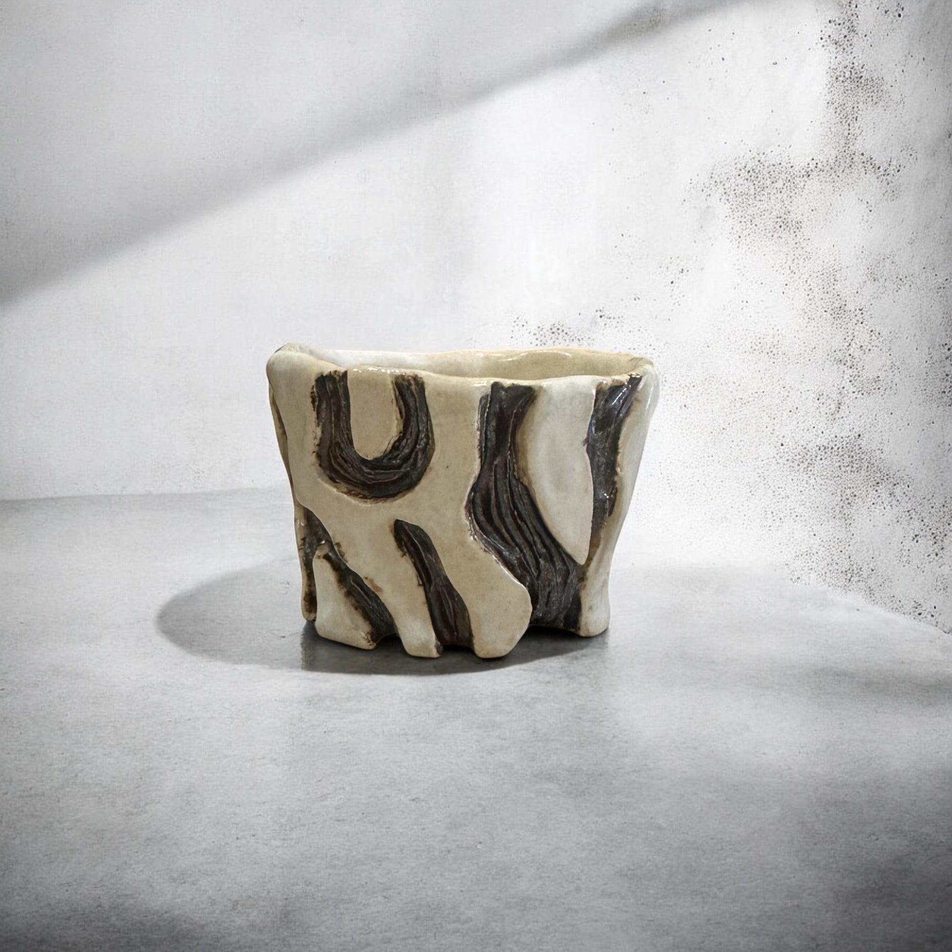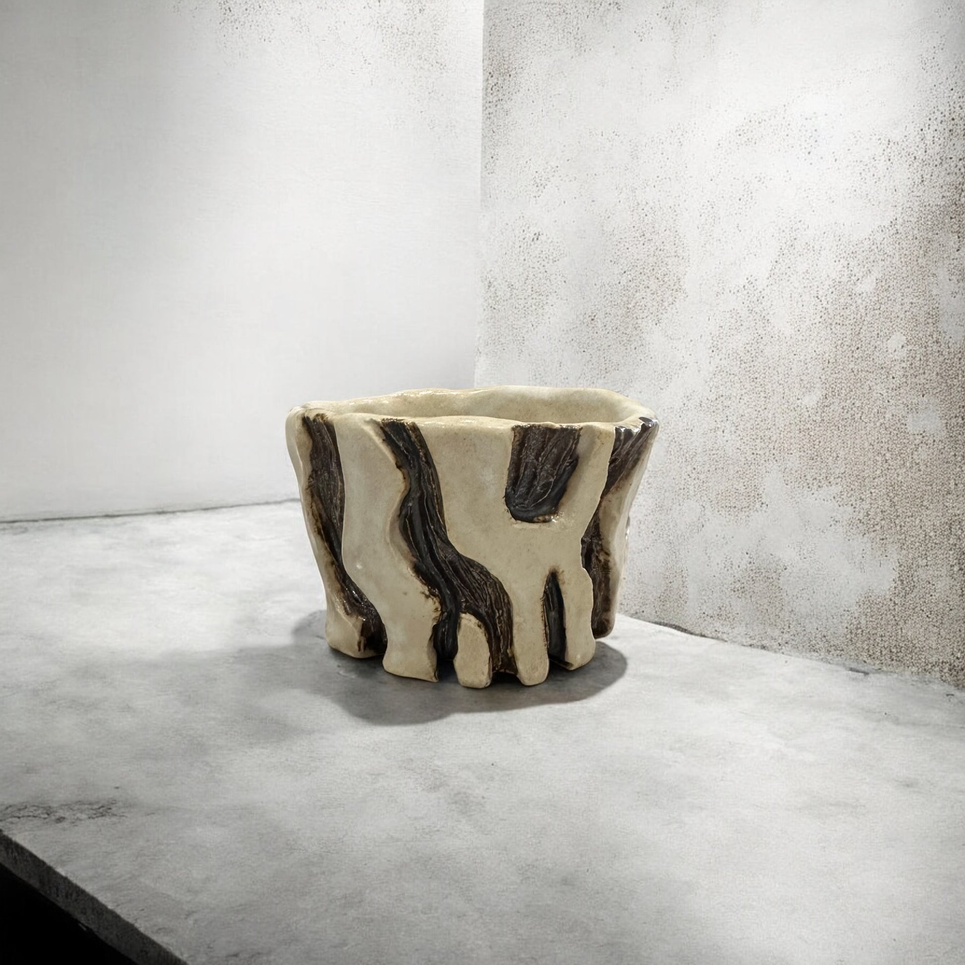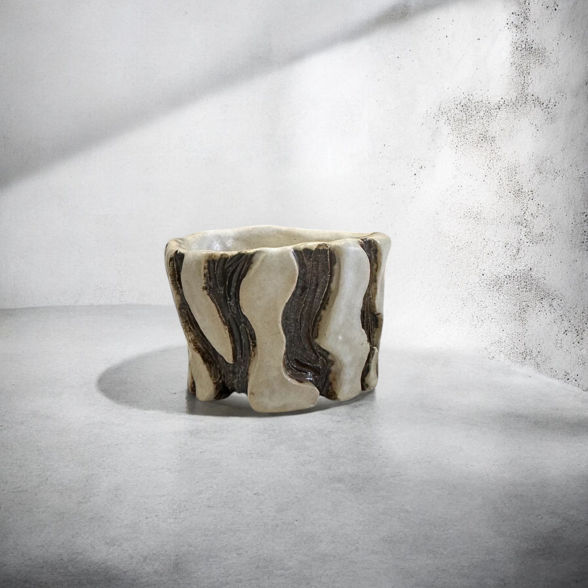 不對稱的輪廓,是刻意留下的手工感;自然流淌的黑釉線條,像是山谷裡的溪流,也像動物奔過林間留下的斑跡。