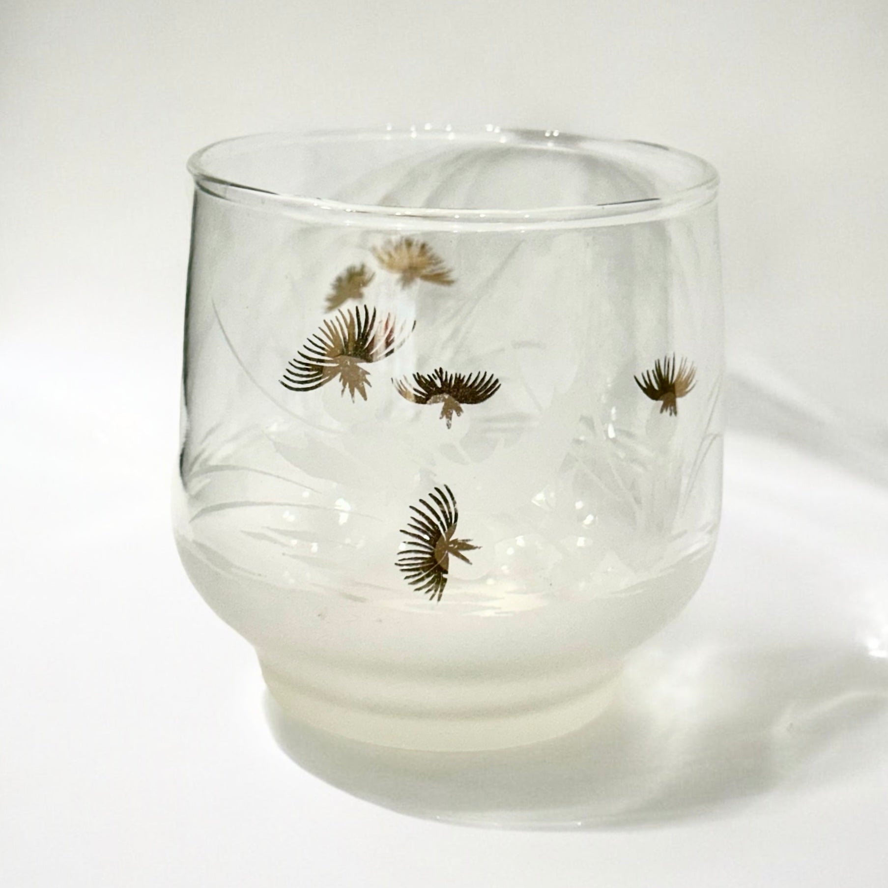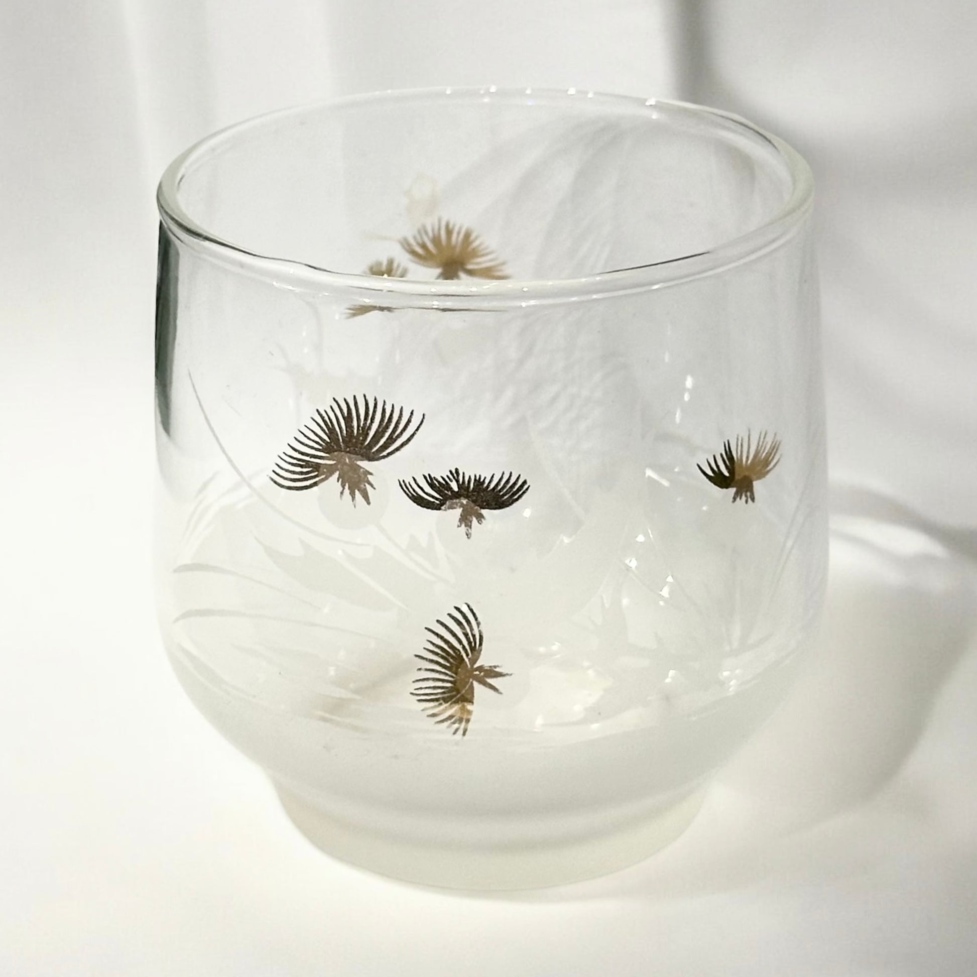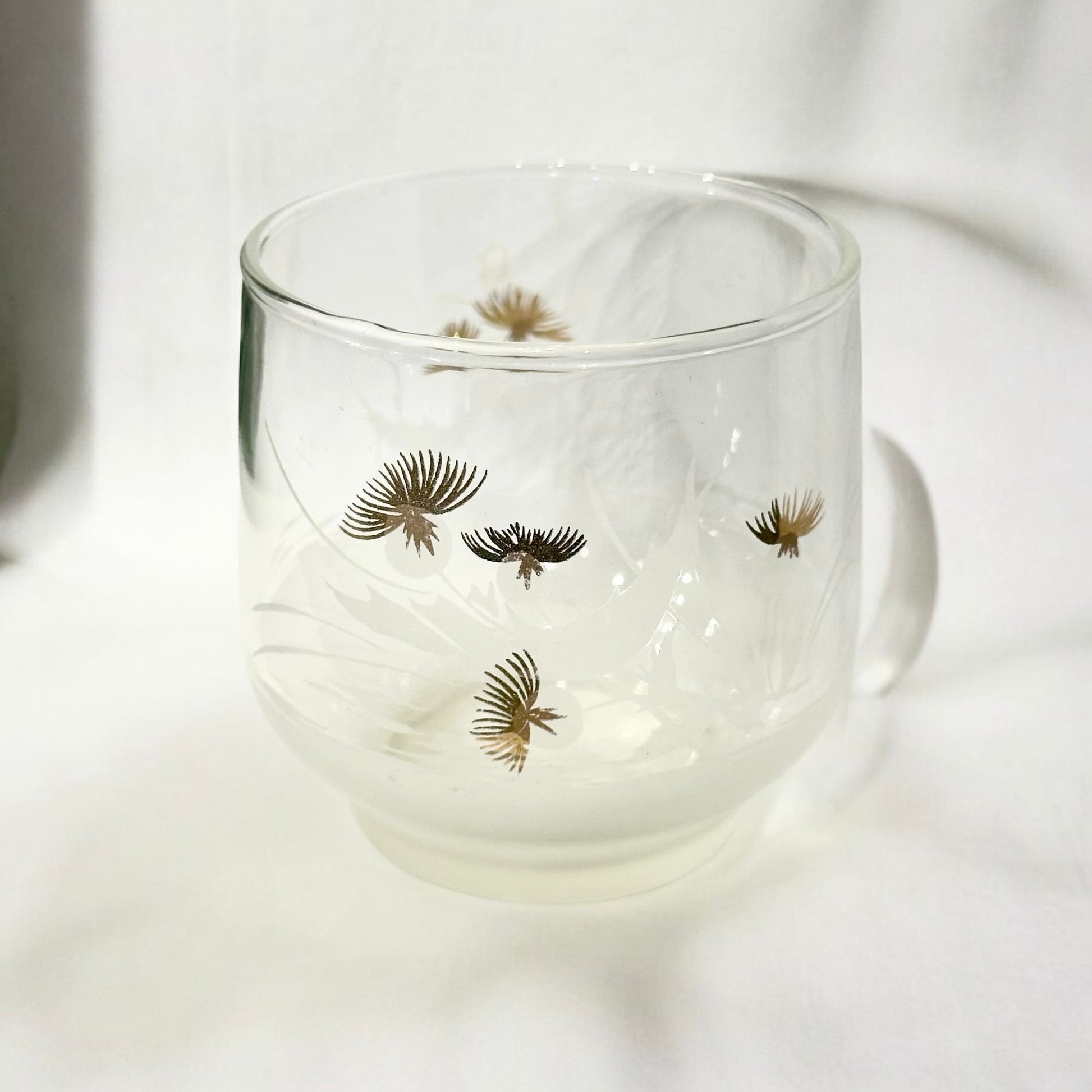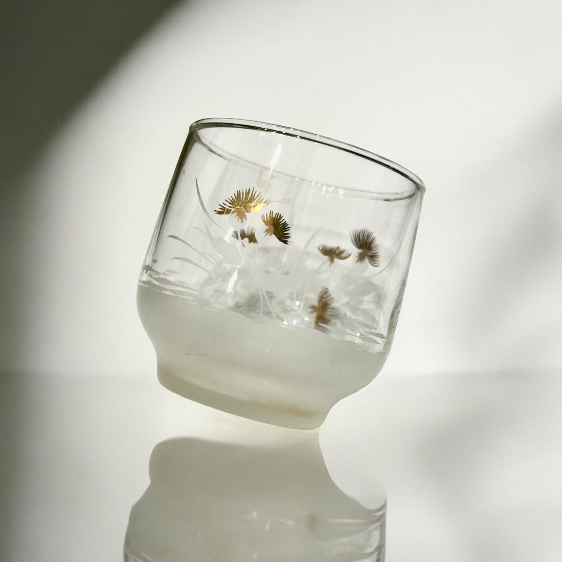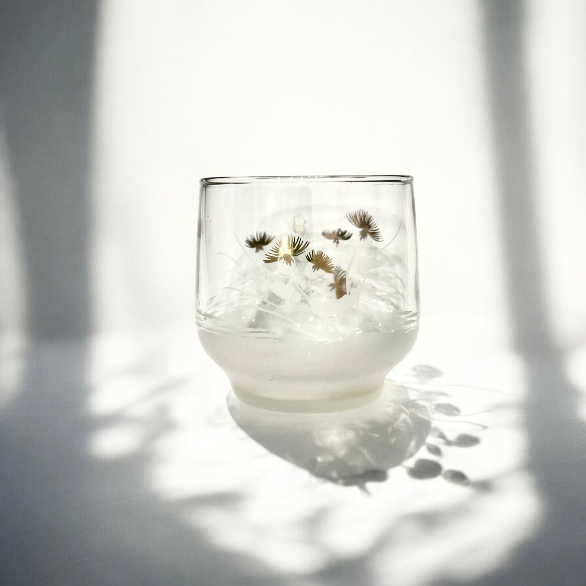 以透明的玻璃材質為基底,杯身上點綴著細緻的蒲公英圖案,彷彿蒲公英的種子在風中飛舞,帶來一種輕盈和自由的感覺。金色的蒲公英種子在光線下閃閃發光,增添了一絲華麗的氛圍。