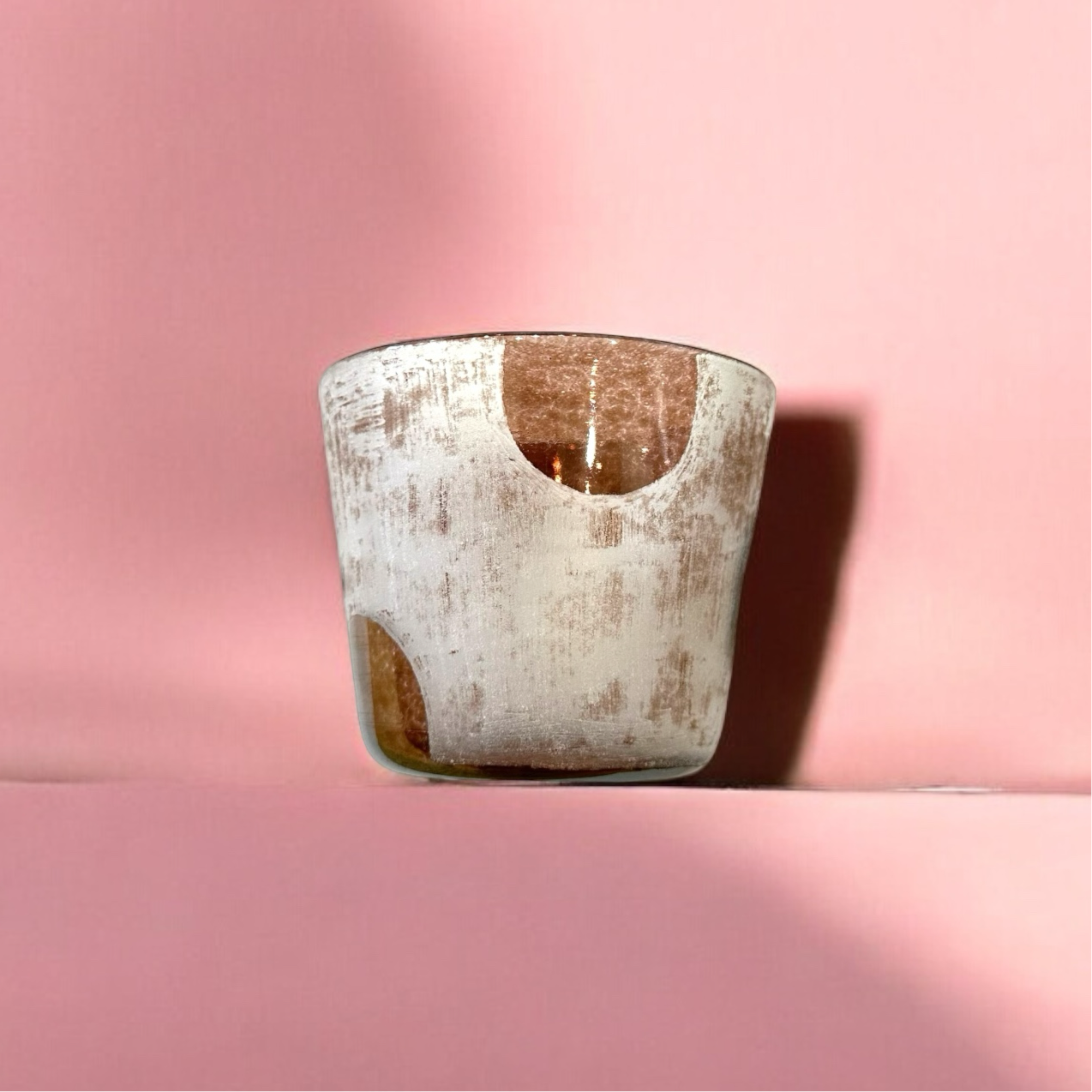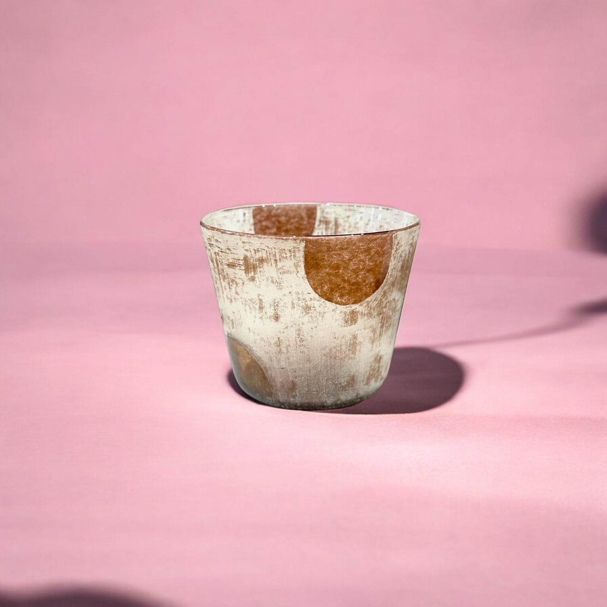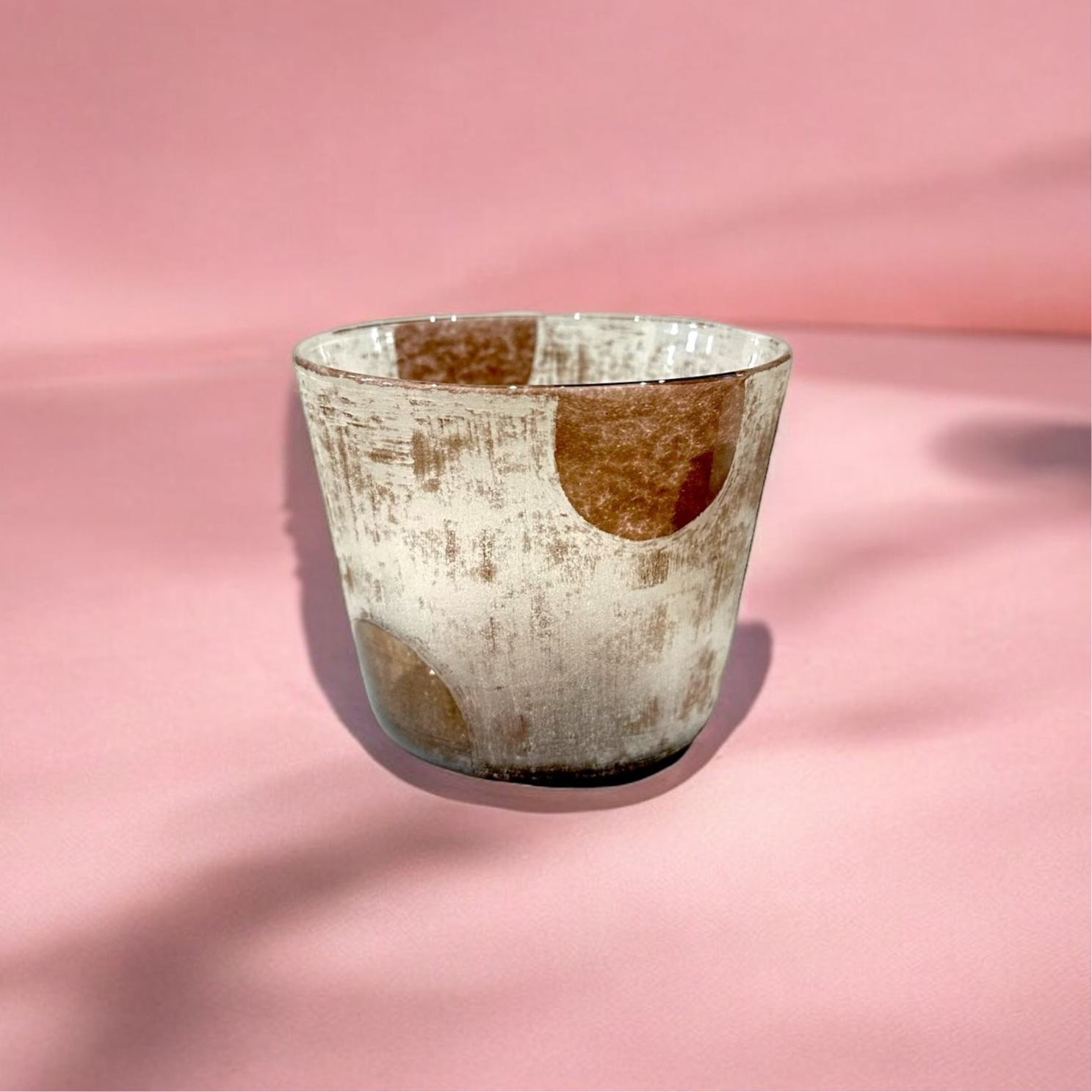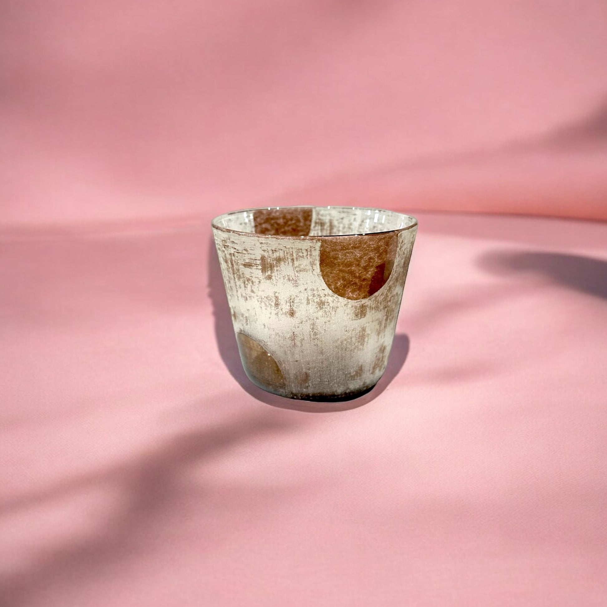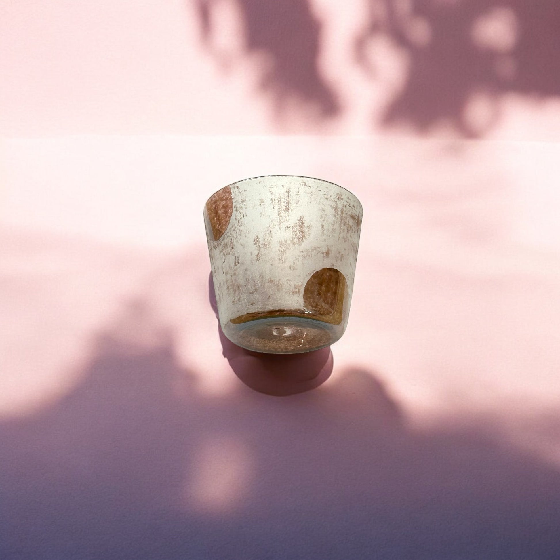 玻璃杯身採用磨霧光面處理,並點綴著圓形透明圖案,營造出復古且時尚的視覺效果。