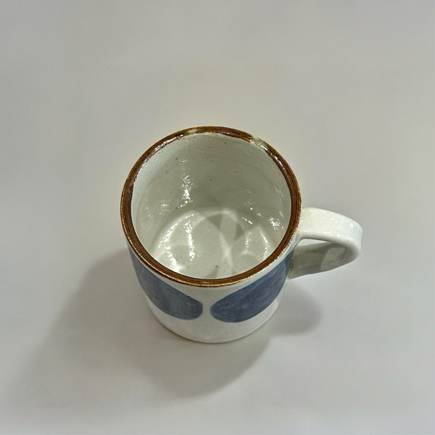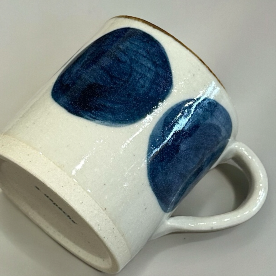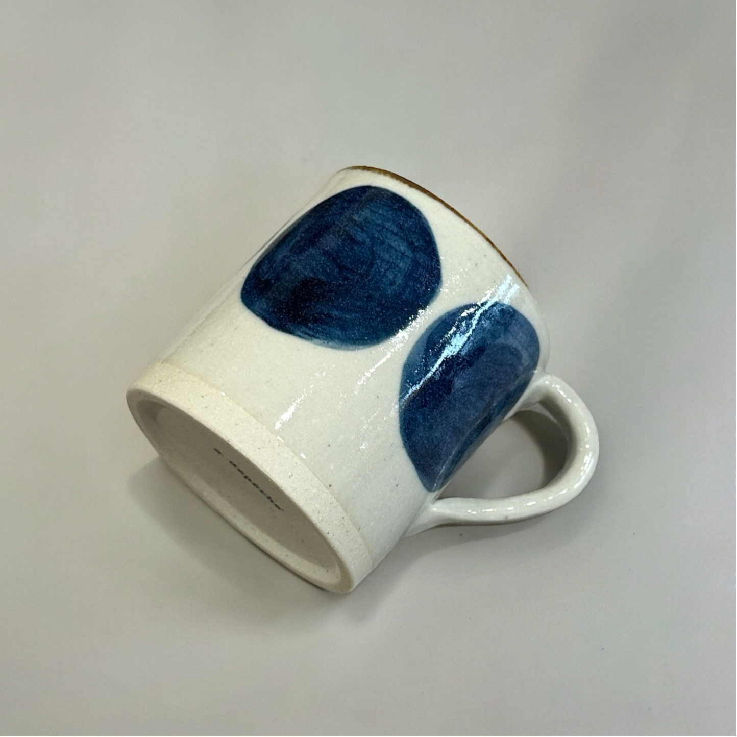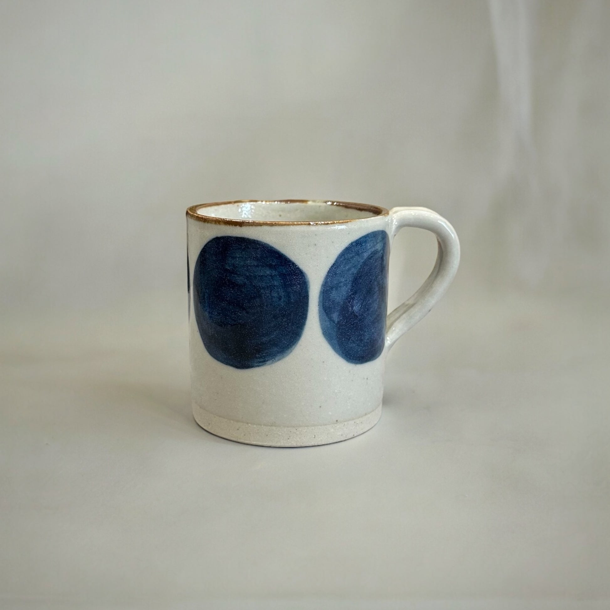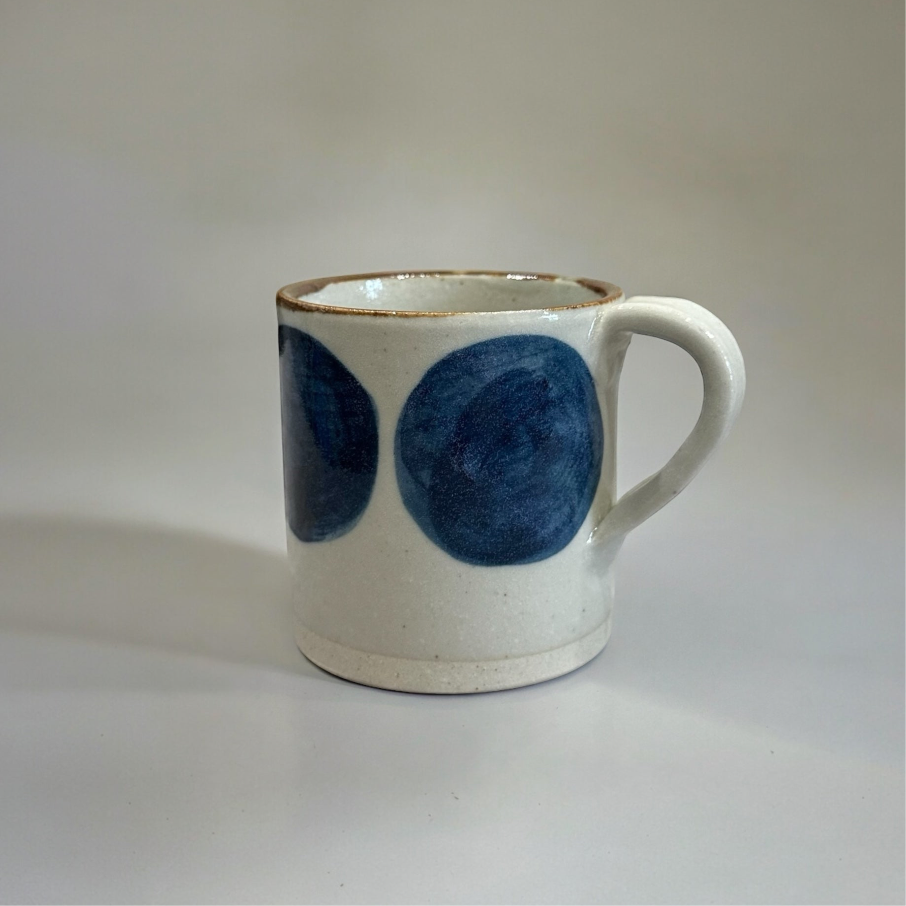 充滿藝術氣息和現代設計,杯身以簡潔的白色為底色,點綴著手繪的深藍色圓點,每個圓點都獨具特色,展現出手工繪製的隨性美。杯口處略帶褐色邊緣,使整體設計更加和諧統一。