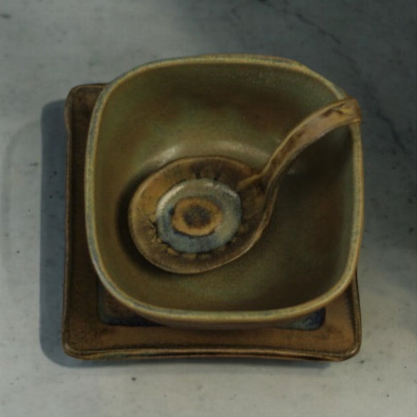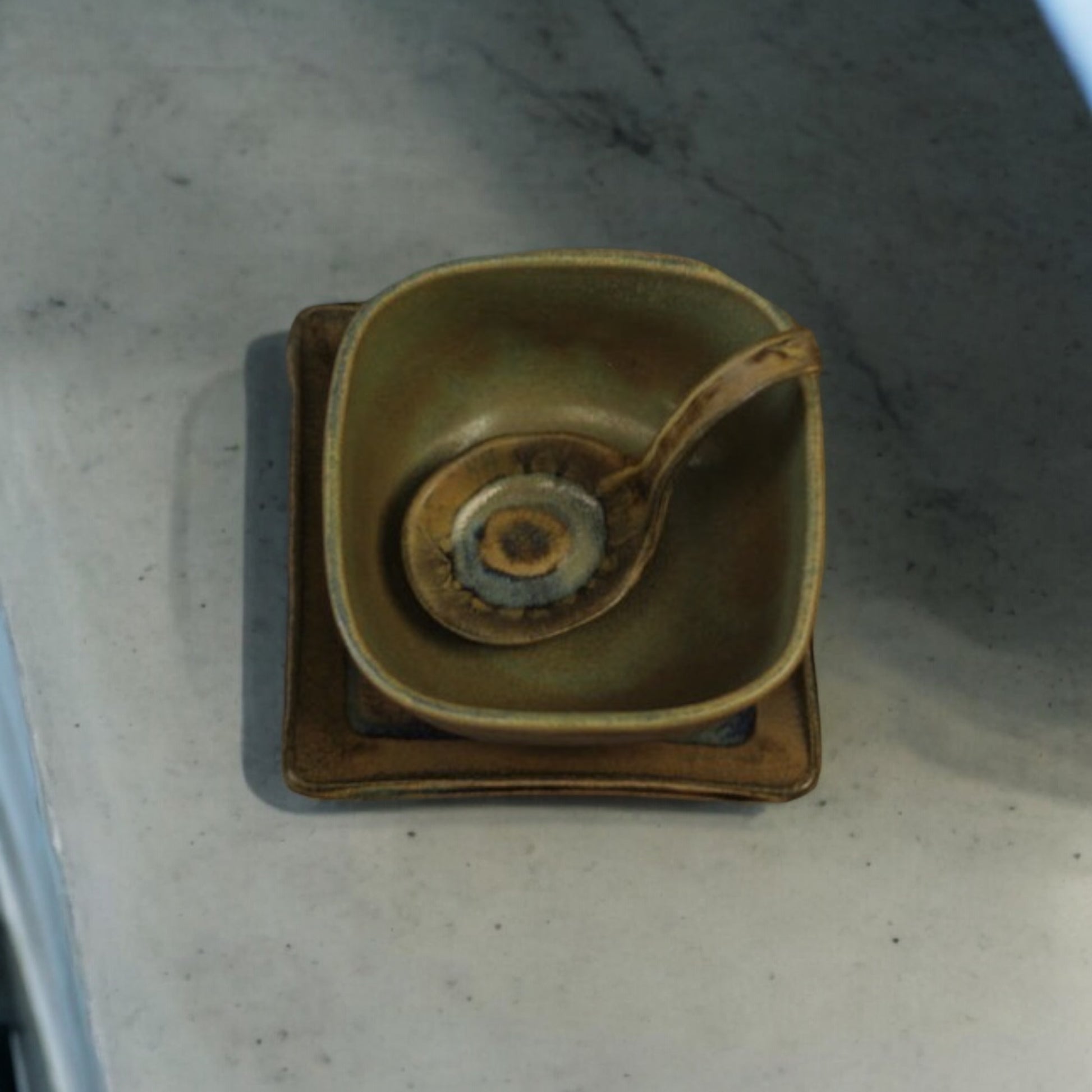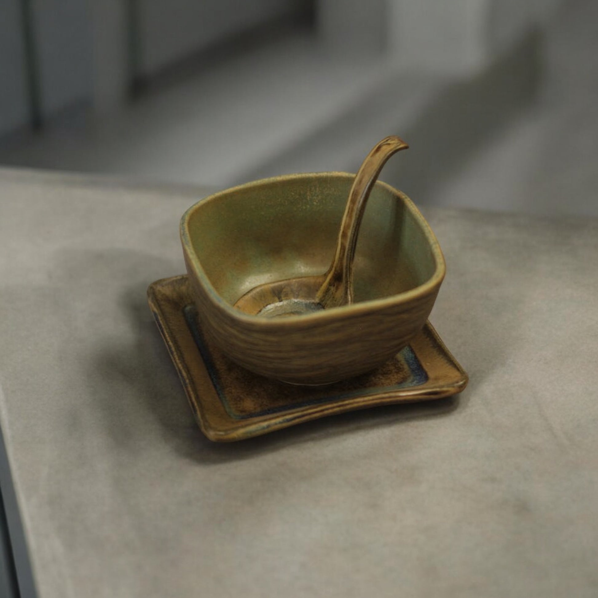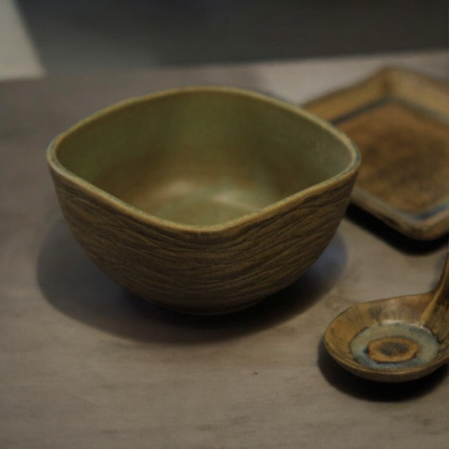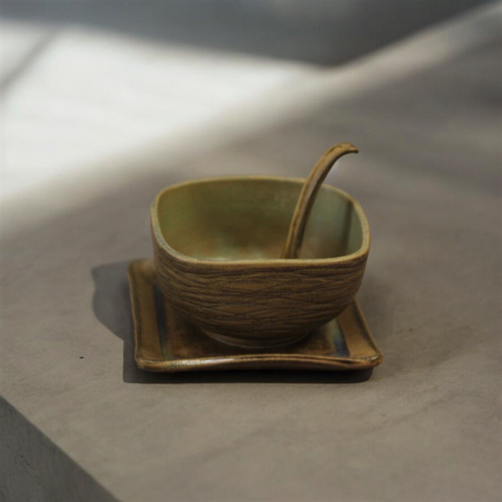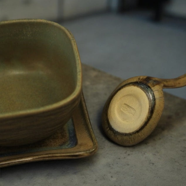 《 添興窯 》 茶碗湯匙組 橄欖綠